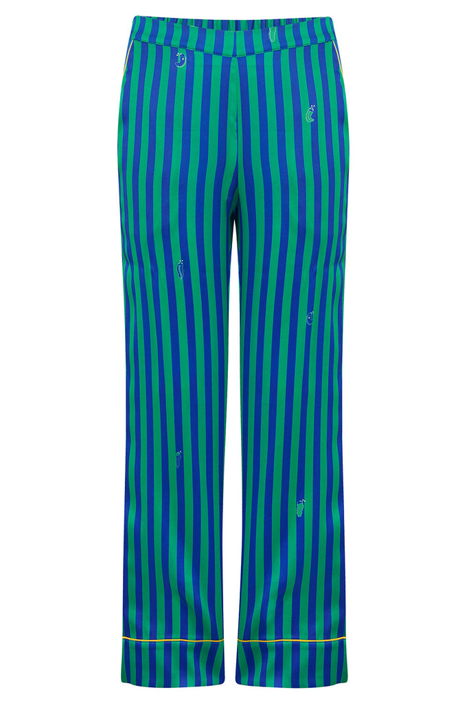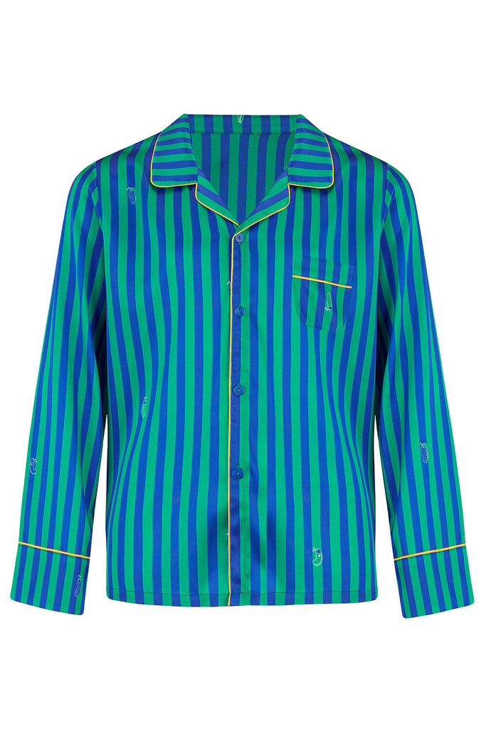 Our classic pyjamas in the Rainforest Stripe print are made from the finest 19 momme silk, trimmed with Honeybee piping and a little extra stretch for the perfect fit.