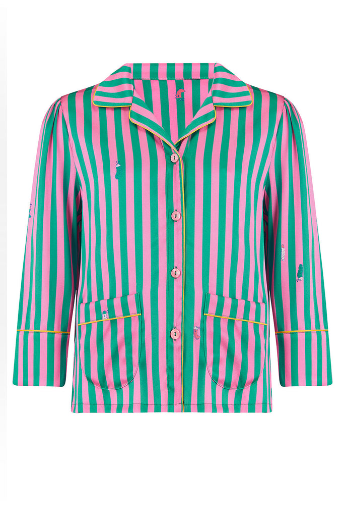 Our classic pyjamas in Flamingo Stripe print, made from the finest 19 momme silk, trimmed with Honeybee piping, adjustable waist ribbon and a little extra stretch for the perfect fit.
