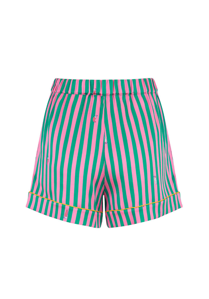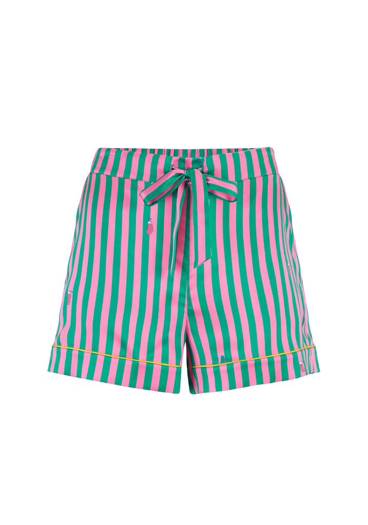 Made from the finest 19 momme silk and trimmed with contrasting Honeybee piping with generous adjustable waist ribbon for the perfect fit, the Rosie short is the perfect addition to the Poppy Flamingo Stripe PJ Shirt.
