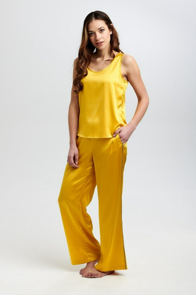 Sleepy Wilson understands how invaluable sleep is to your health and overall well-being. Our classic Aurelie Silk Trouser in the rich Honeybee is made using the highest quality 19 momme silk, trimmed with contrasting peacock blue piping you’ll look good and feel good wherever you are.