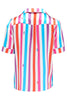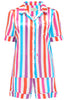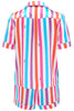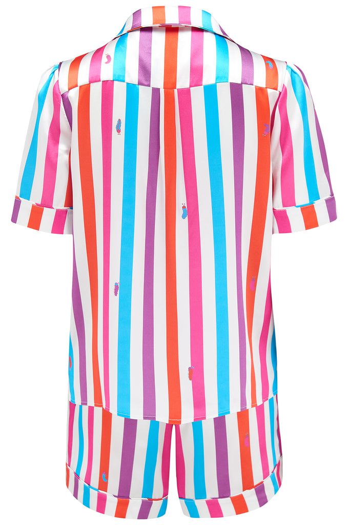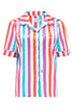 The Poppy Silk blouse in Hawaiian Stripe, finely tailored to give a closer fit but with enough stretch to allow for easy movement in bed. Made from the finest 19 momme silk, trimmed with matching piping and adorned with our signature shell button.